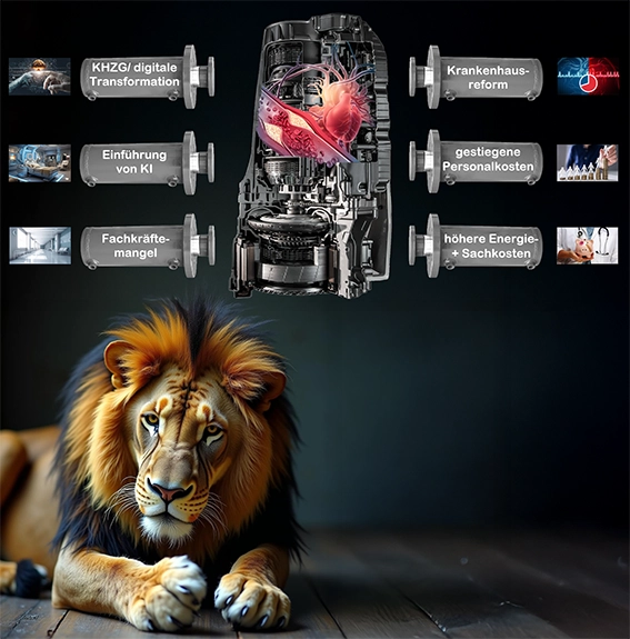 Ihre Vielzahl an Themen und der damit einhergehende Druck ist nur mit wenigen anderen Wirtschaftsbereichen vergleichbar. Neben der Umsetzung der KHZG-Millionen-Projekte stehen Sie als GeschäftsführerInnen mit Ihren Kliniken vor weiteren massiven Herausforderungen. Hierzu zählen die Kostenentwicklung (Tariferhöhung und Inflation plus 10%), gesetzlich gedeckelte Budgeteinnahmen und Erlösrückgänge (9% 2019-2023) sowie der Fachkräftemangel bis hin zu Stationszusammenlegungen und Bettensperrungen.